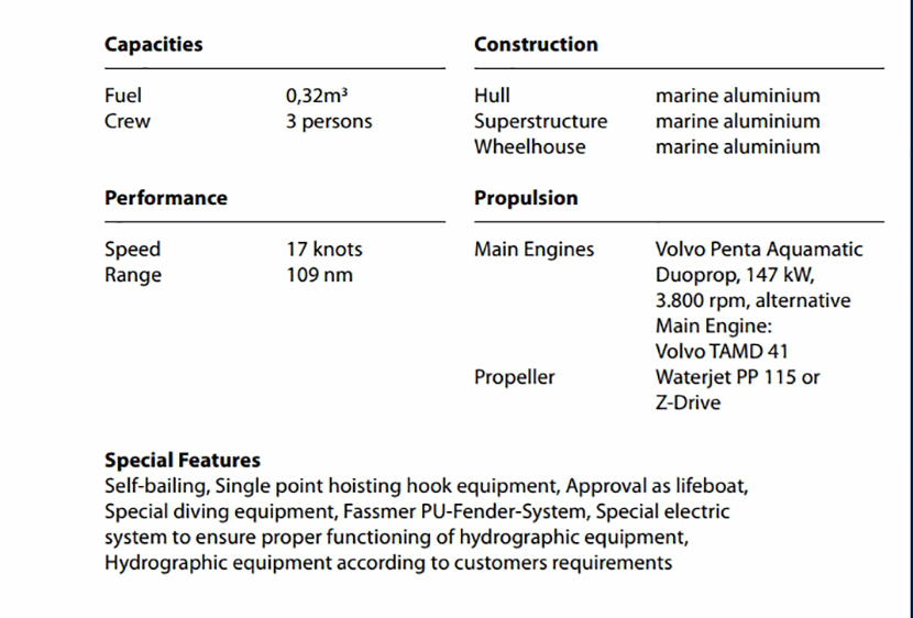 | 排水量: | 4.2t | 發(fā)動機品牌: | Volvo Penta Aquamatic Duoprop |