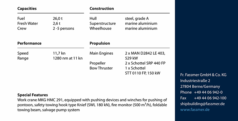 | 艏側(cè)推: | 1 x Schottel STT 0110 FP, 150 kW | 淡水: | 2.6t |