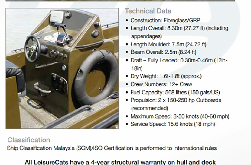 | 最大乘員: | 12p | 推進裝置: | 2×150-250 hp 舷外機 |