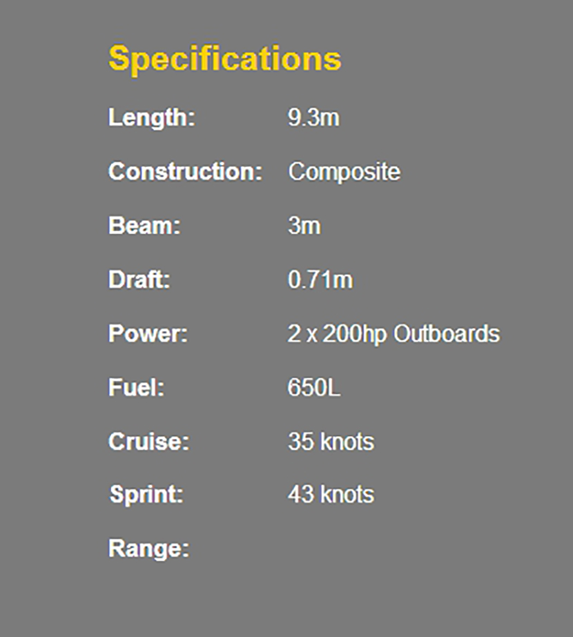 | 總長(zhǎng): | 9.3m | 航速: | 35kn |