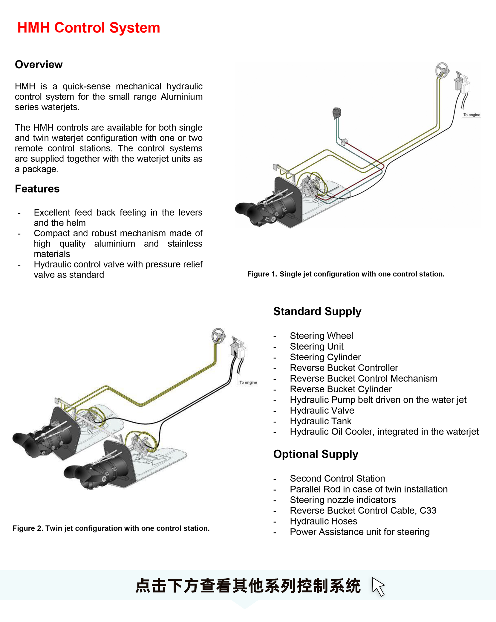 | 系統(tǒng)特點(diǎn): | ·For Single, Twin, Twin with Booster or Quad waterjet installations ·Auto positioning ·Auto heading ·Anchor point ·Trim Assist ·Interceptor steering ·Park mode ·Remote service access readiness ·Up to three control stations ·Up to four waterjets ·Integrated joystick ·High contrast display with keypad and touch ·Compact design ·Plug-in assembly |